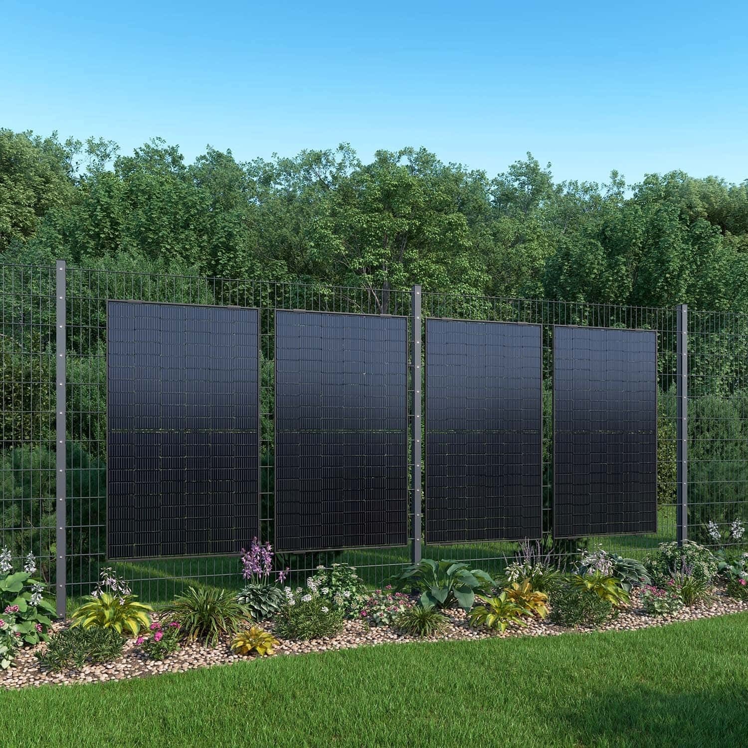 Die in den Sets enthaltenen Solarmodule in Full-Black-Optik verfügen über eine bifaziale Eigenschaft – wie geschaffen für Gitterzäune. Denn hierdurch sind sie in der Lage, nicht nur über die Vorderseite, sondern auch zusätzlich über die Rückseite Sonnenstrahlen aufzunehmen und Solarenergie zu erzeugen.