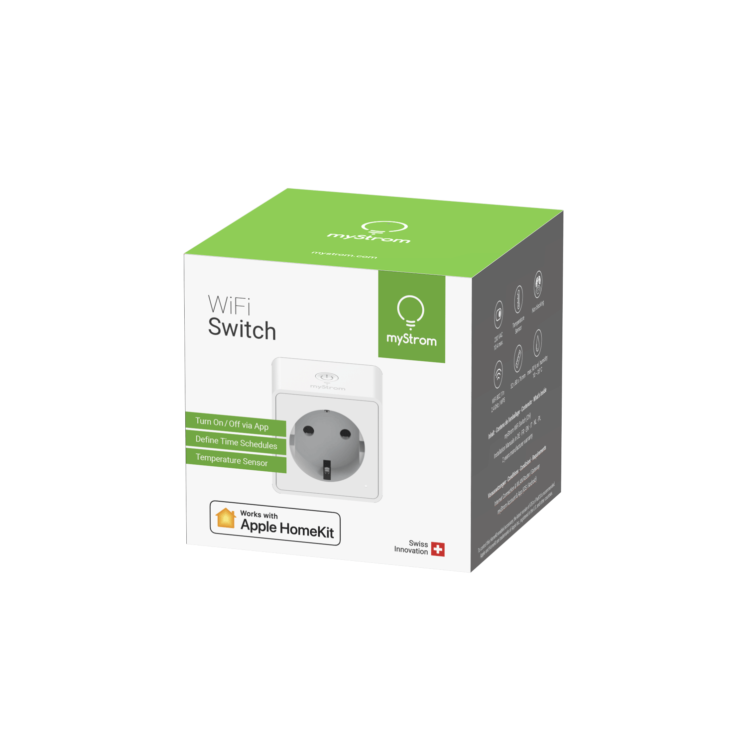 - Voraussetzungen: WLAN-Gateway/Zugangspunkt sowie myStrom App und Apple iOS 8 oder höher oder Android 4.4 oder höher