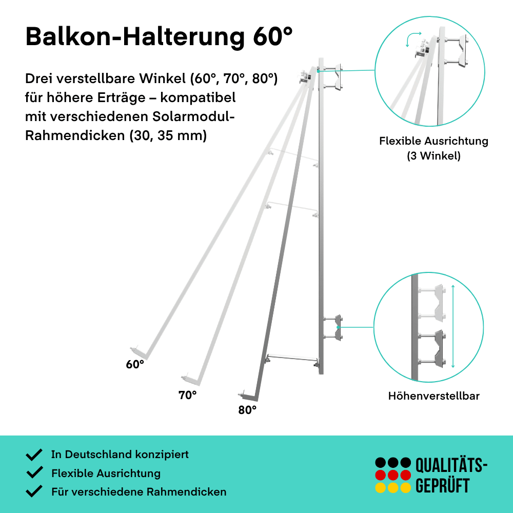 Die Halterung verfügt über ein flexible Aufständerung, die drei verschiedene Neigungswinkel ermöglicht: 60°, 70° oder 80°. Durch die variable Neigung zur Sonne lassen sich optimale Energieerträge erzielen. Zudem kannst du die Halterung bei Bedarf mithilfe eines speziellen Modulhalters auf verschiedengroße Solarmodul-Rahmendicken einstellen: 30 und 35 mm.