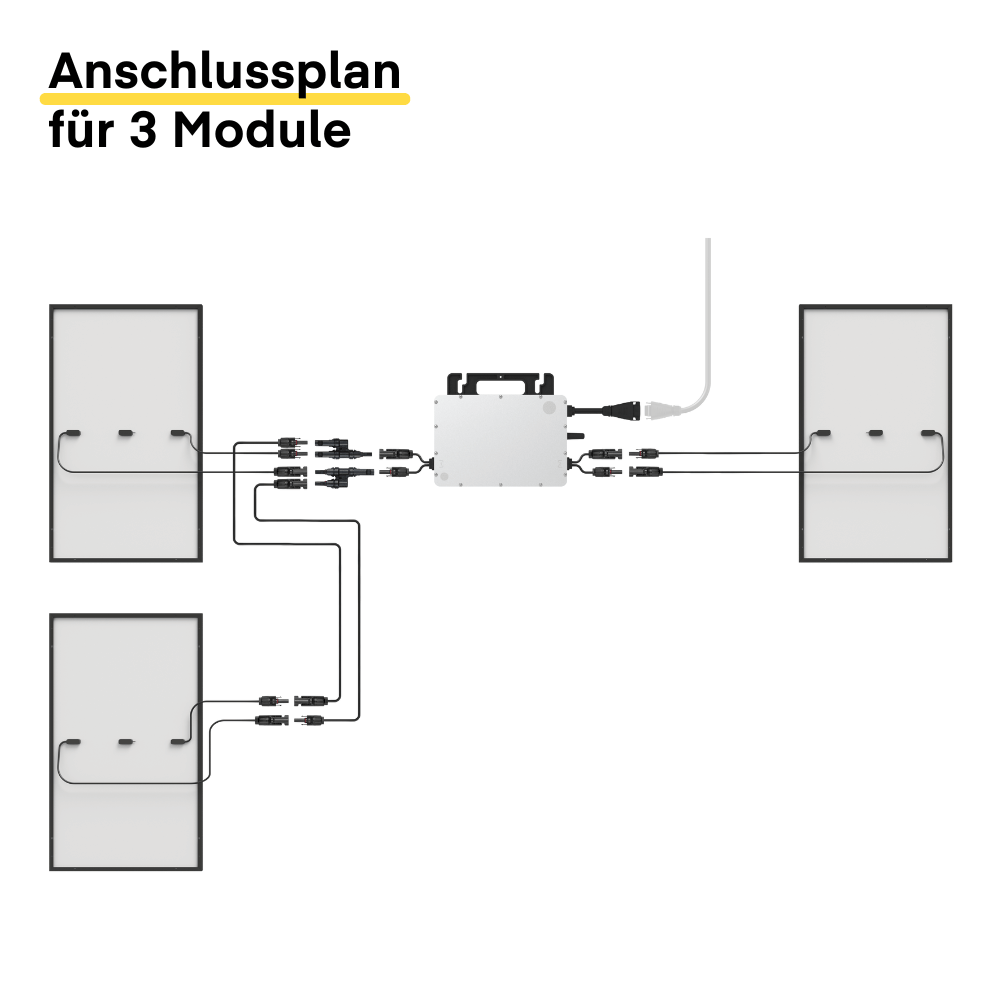 Hinweis: Der HMS-800W-2T verfügt über zwei Solarmodul-Eingänge. Das mitgelieferte Y-Stecker-Paar ermöglicht den Anschluss von zwei Solarmodulen an einen Eingang. Damit kannst du insgesamt drei Solarmodule anschließen.
