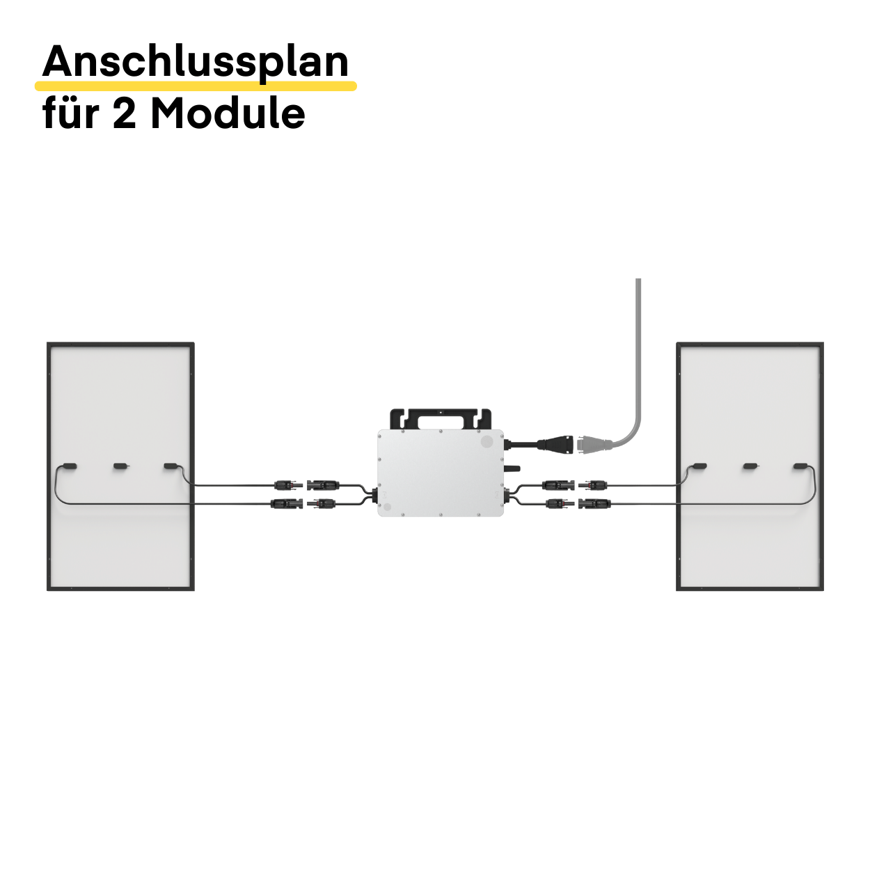 Dem Paket liegen Verlängerungskabel (1x 2 m) bei, um die Solarmodule mit dem Wechselrichter zu verbinden. Mit den Kabelbindern kannst du die losen Kabel befestigen. Mit der Verschlusskappe kannst du den in der Regel nicht benötigten Eingang des Wechselrichters verschließen.