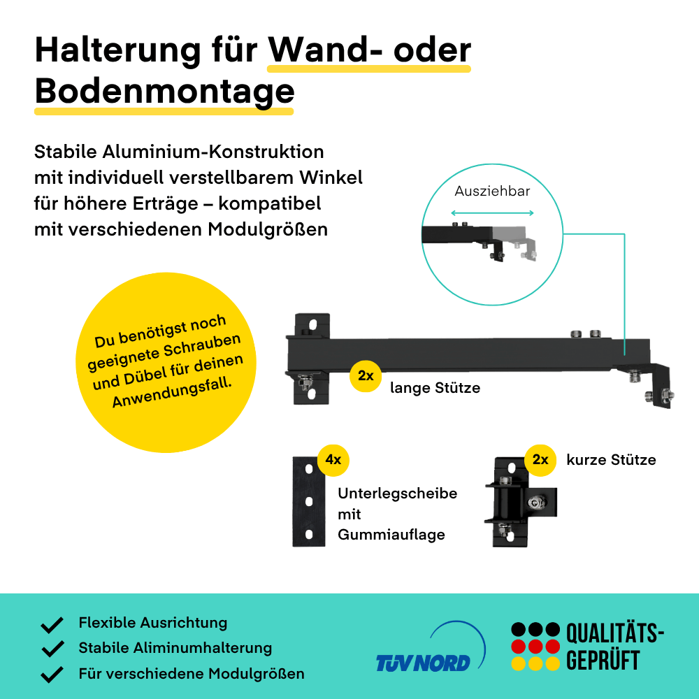 Stabile Halterung für die Wand- oder Bodenmontage. Der Winkel lässt sich flexibel einstellen und zur Sonne ausrichten. Zur Montage benötigst du eine Bohrmaschine und geeignete Schrauben und Dübel.