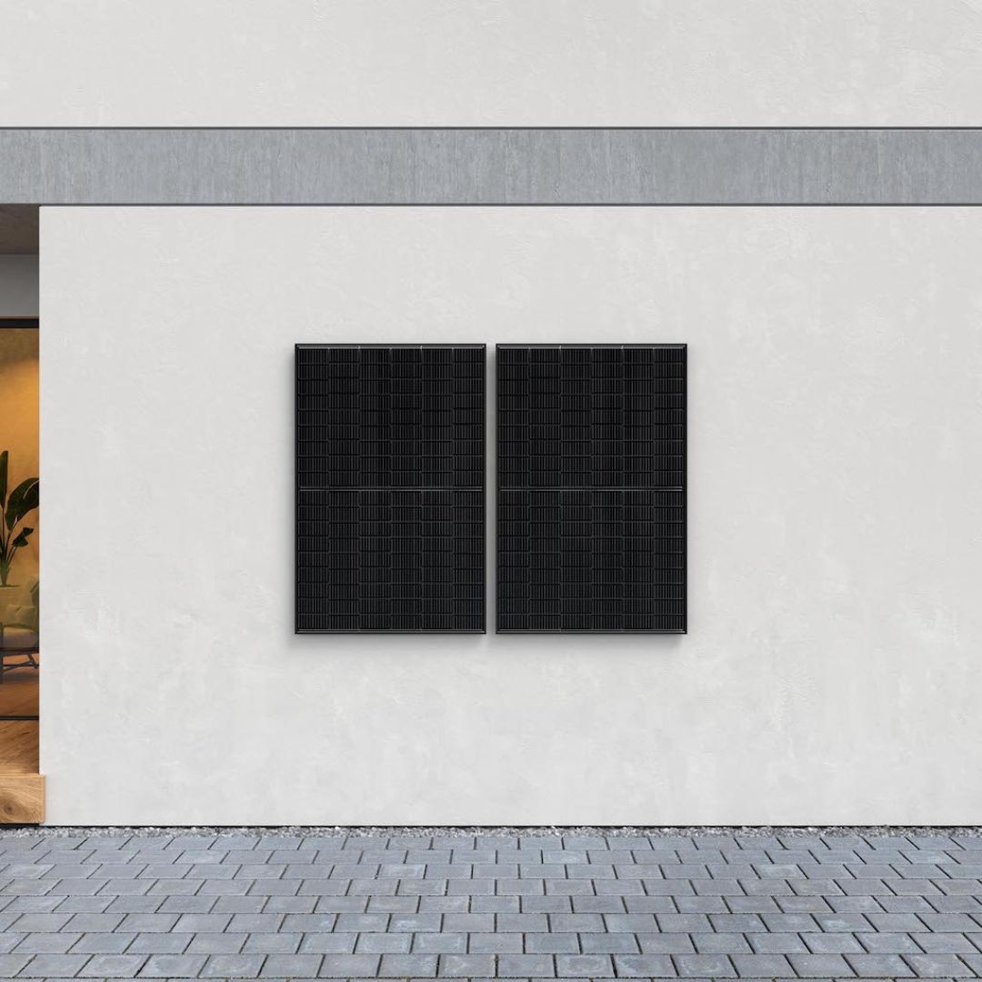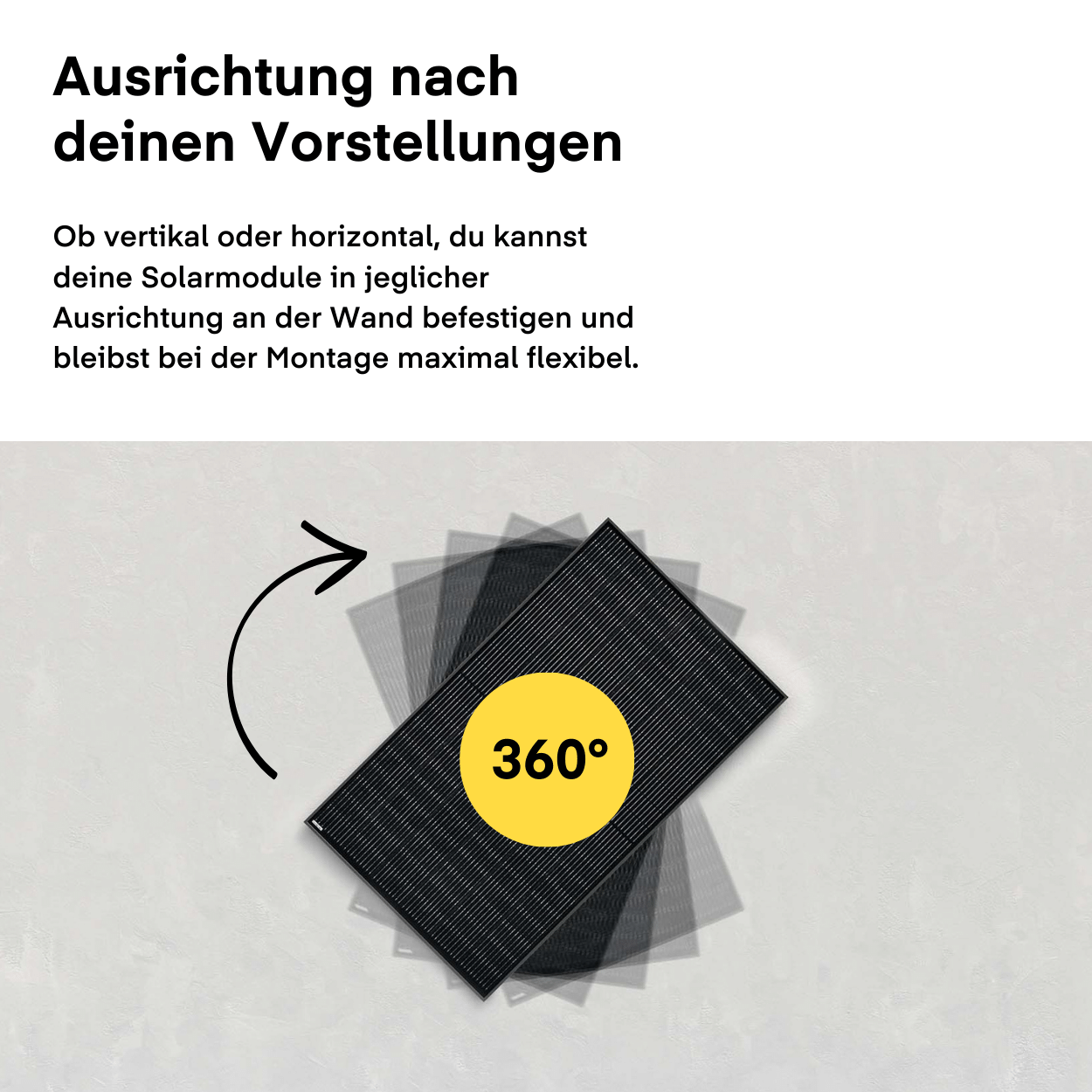 Der Neigungswinkel ist feststehend und beträgt 90°. Die Halterungen sind “made in Europe” und bestehen aus witterungsbeständigem Aluminium. Pro Modul werden vier Halterungen mitgeliefert, sodass sich die Solaranlage sowohl horizontal als auch vertikal anbringen lässt. Da die Halterungen nur 60 mm Wandabstand zum Modul messen, ist die Anlage besonders platzsparend und ermöglicht eine schlanke Installation an Fassaden in Einfahrten, Zugängen o. Ä.