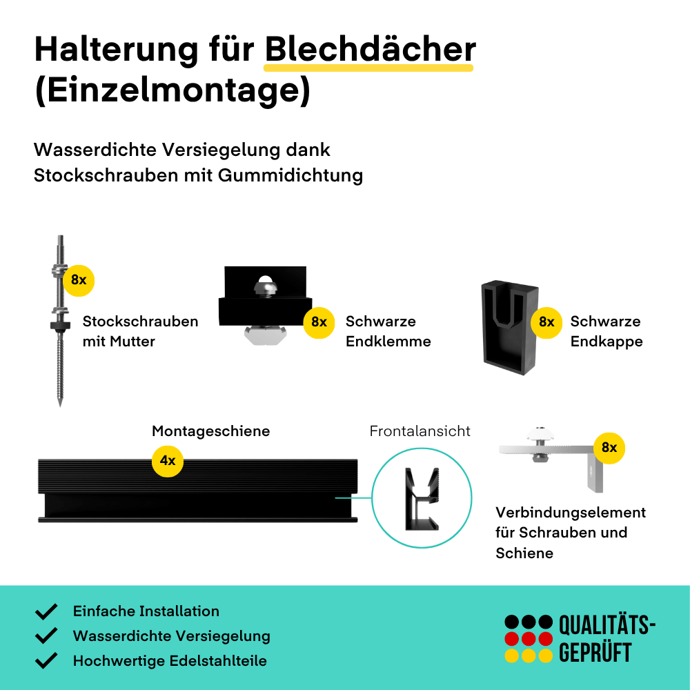 Schrägdach-Unterkonstruktion für die Einzelmontage auf dem Blechdach, bestehend aus einem Schienensystem, Modulklemmen und abdichtenden Stockschrauben. Teile aus Edelstahl und Aluminium, zuverlässig und langlebig.