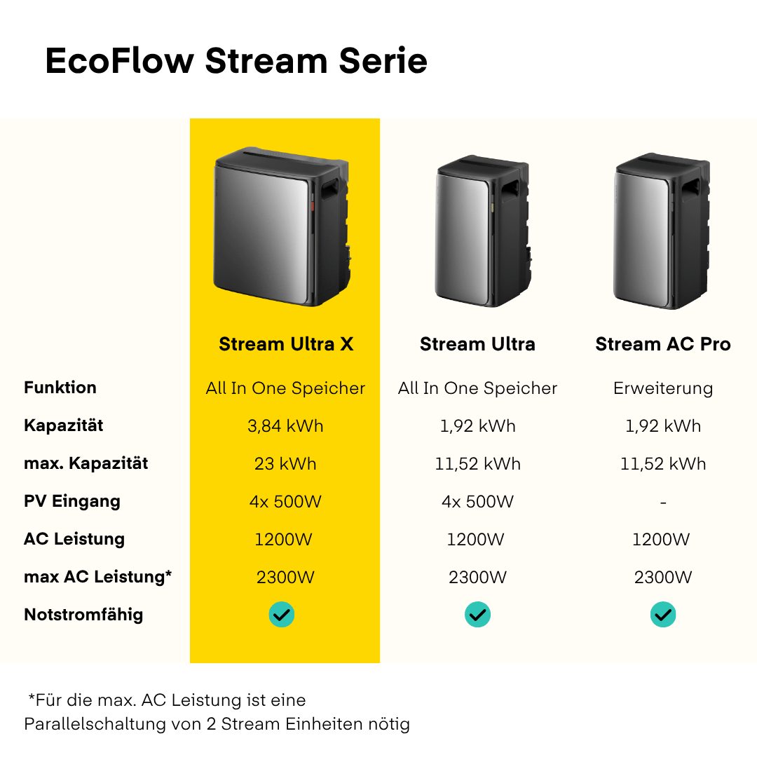 Alternativ kannst du auch zwei Stream AC Pros parallel verbinden, um 2300 W Ausgangsleistung zu erhalten. Dies kann sinnvoll sein, wenn du die Stream Ultra zur Stromerzeugung nutzen und die AC Pros zur Versorgung eines großen Verbrauchers wie eine Waschmaschine einsetzen möchtest.
